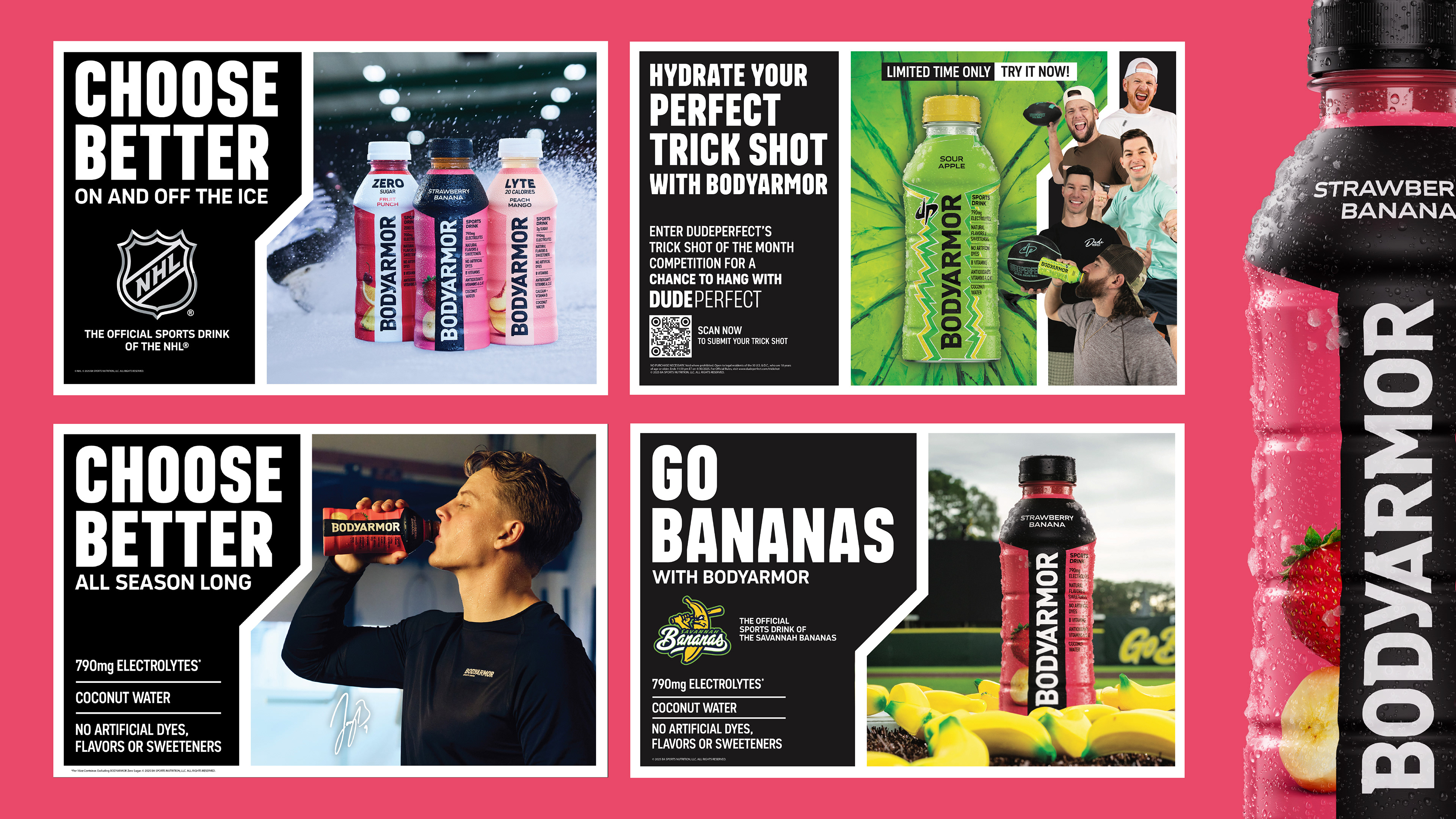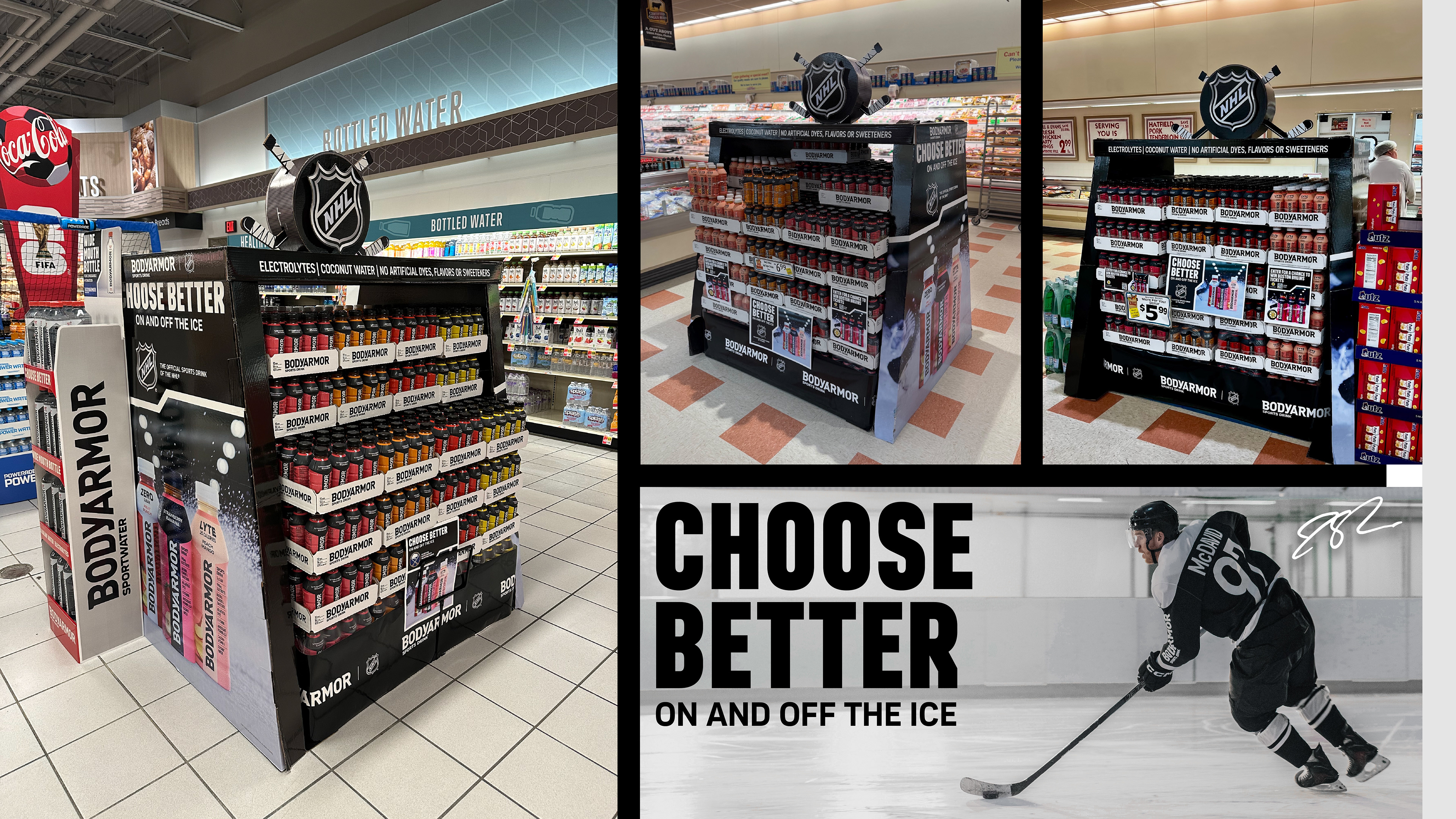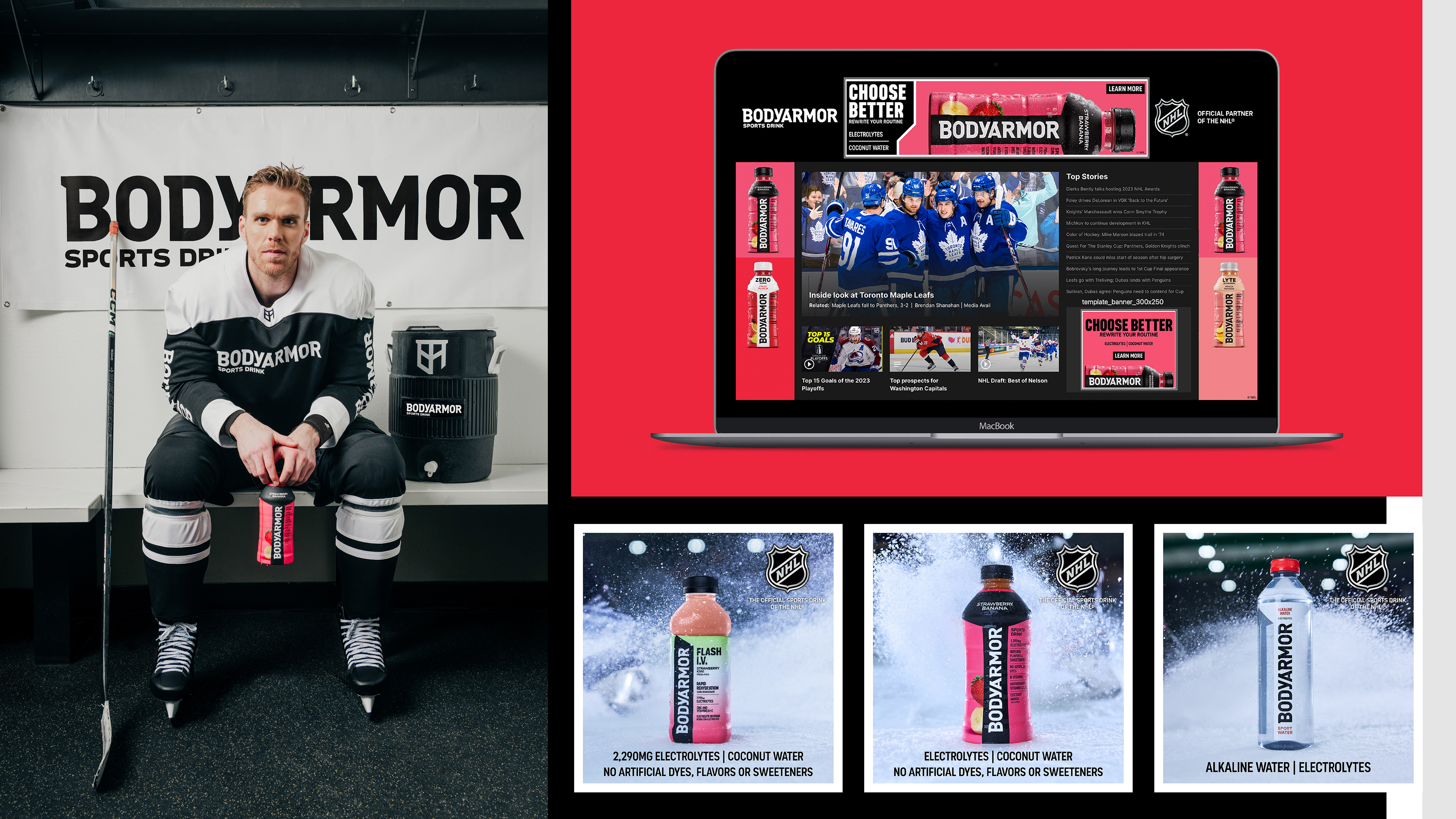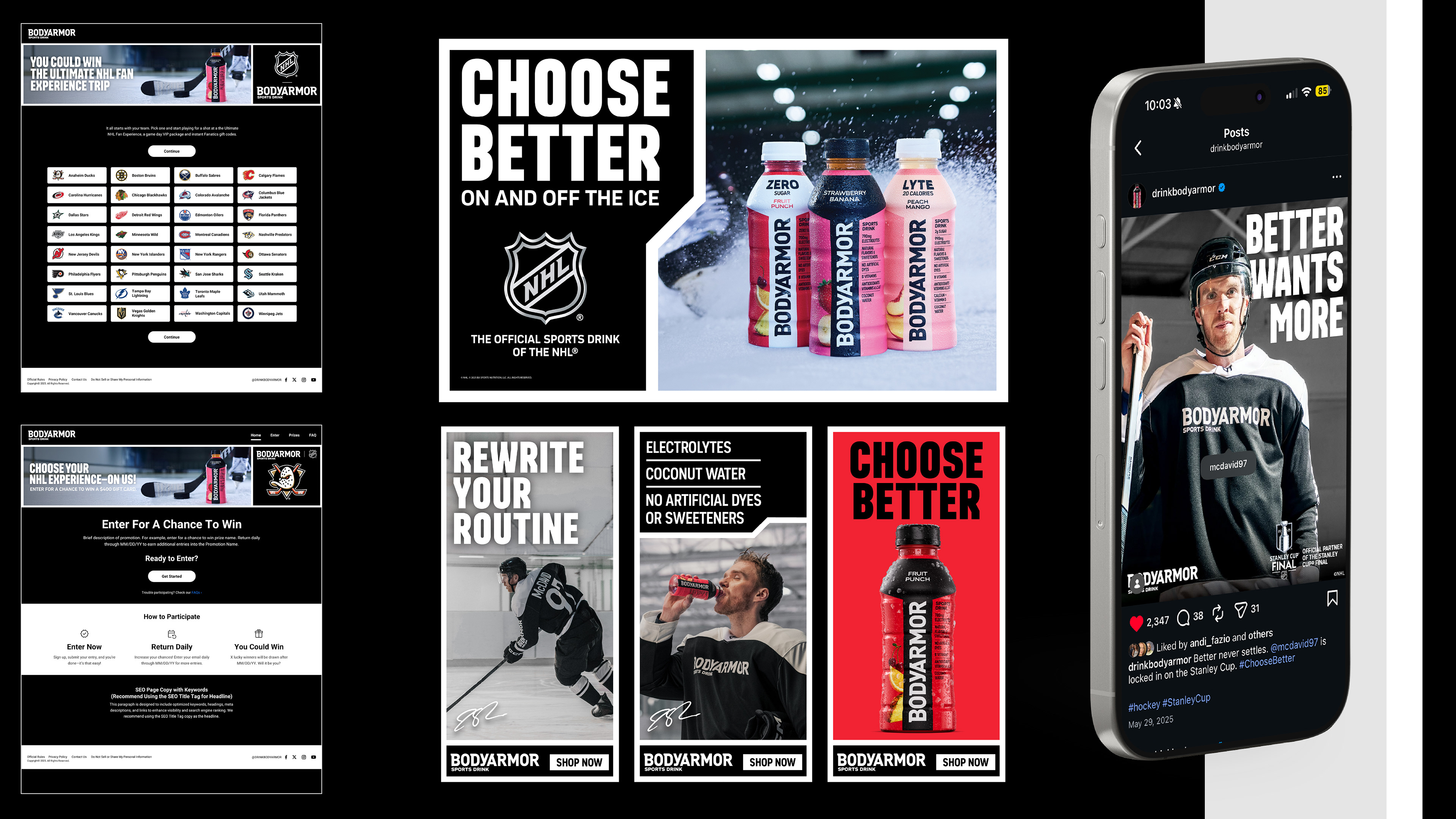 Since 2024, I have led the design of the complete creative system for BODYARMOR’s NHL partnership, culminating in the 2025 visual relaunch adapted across retail, digital, eCommerce, and experiential channels. I designed custom graphics for NHL Digital Enhanced Dasher (DED) boards and physical dasher placements, translating the brand system into a fast-paced broadcast and in-arena environment while maintaining clarity, legibility, and strong visual impact.