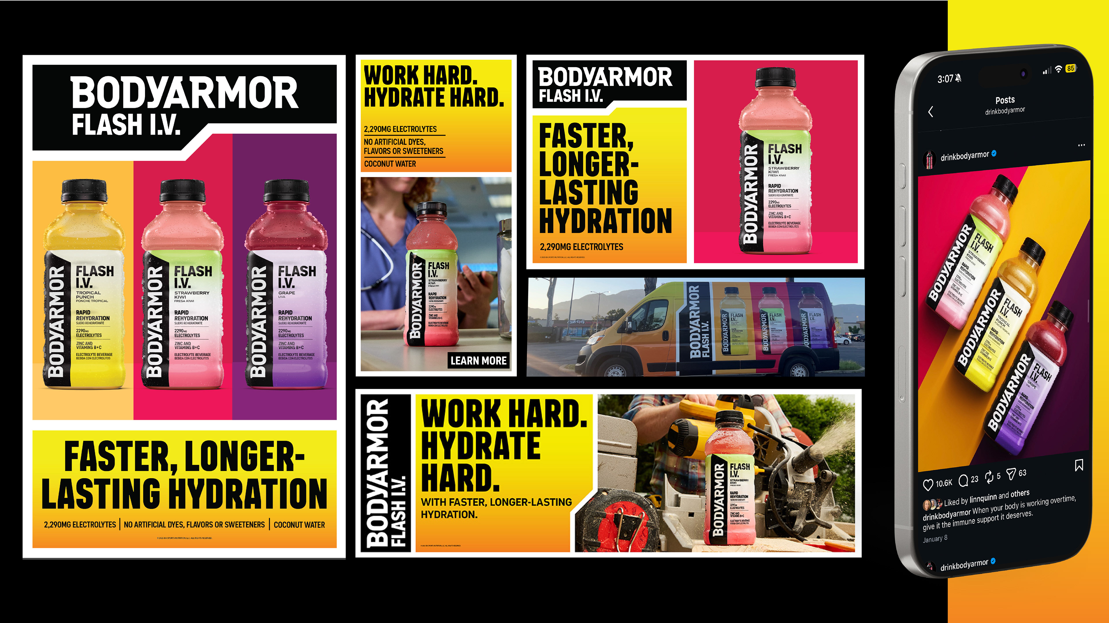 To launch the campaign, the first wrapped bus made a memorable debut at the Beer Games held at Taylor Lewan’s house, leveraging BODYARMOR’s Barstool partnership. This fully customizable bus has also turned heads at Nashville’s Breakaway Music Festival and Miami’s Country Bay Festival, bringing the Flash I.V. activation to life in an exciting and interactive way.