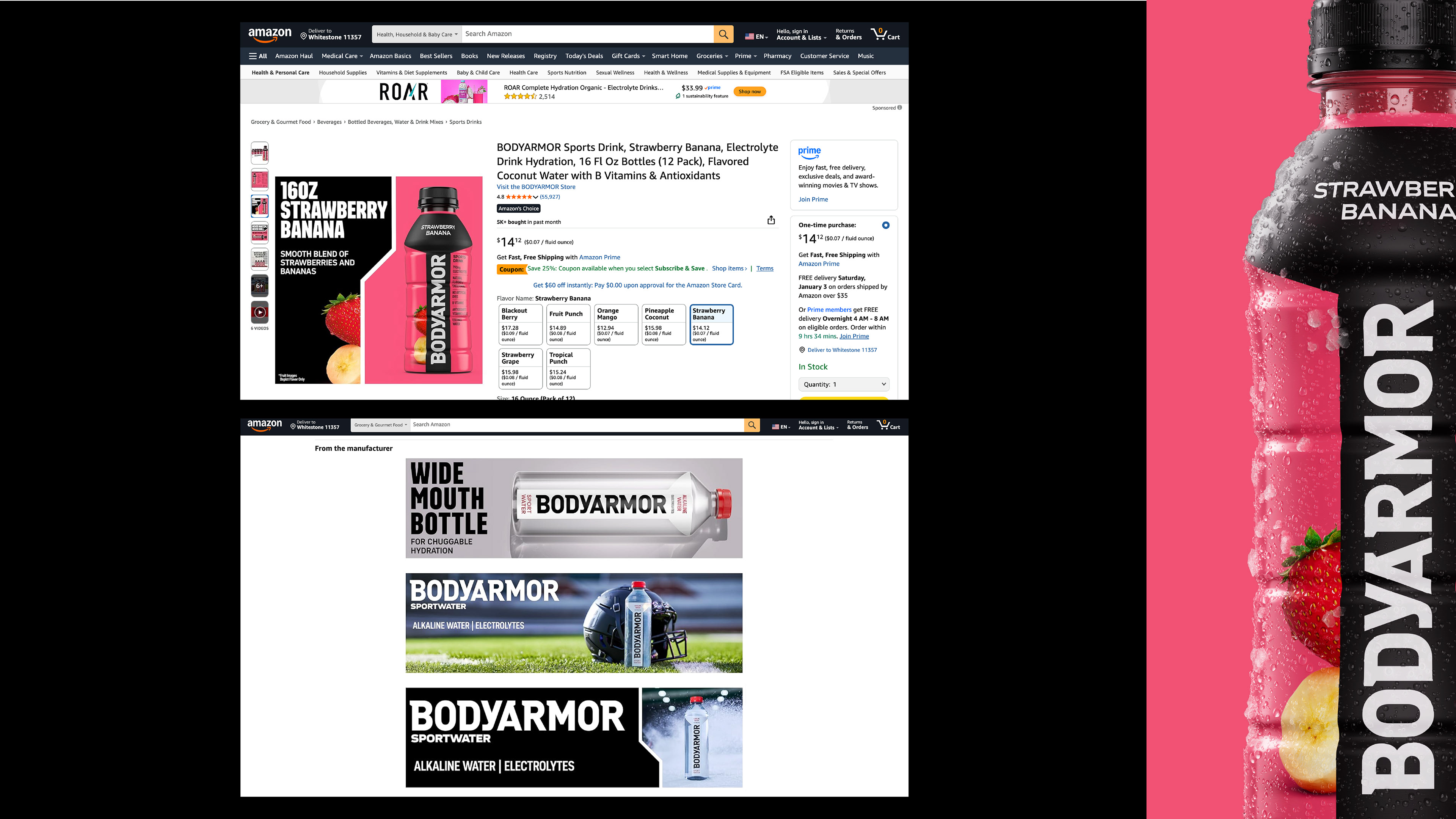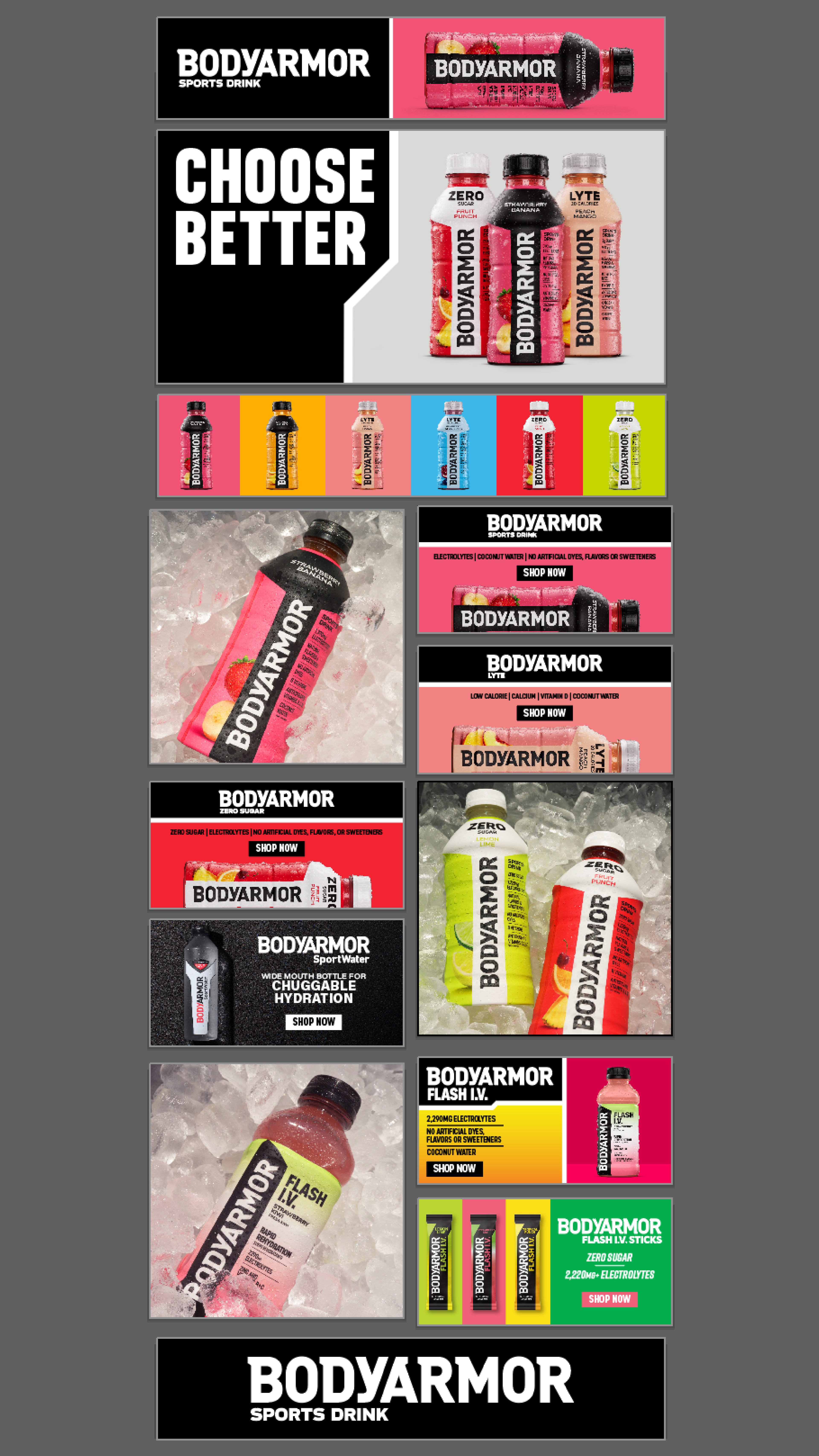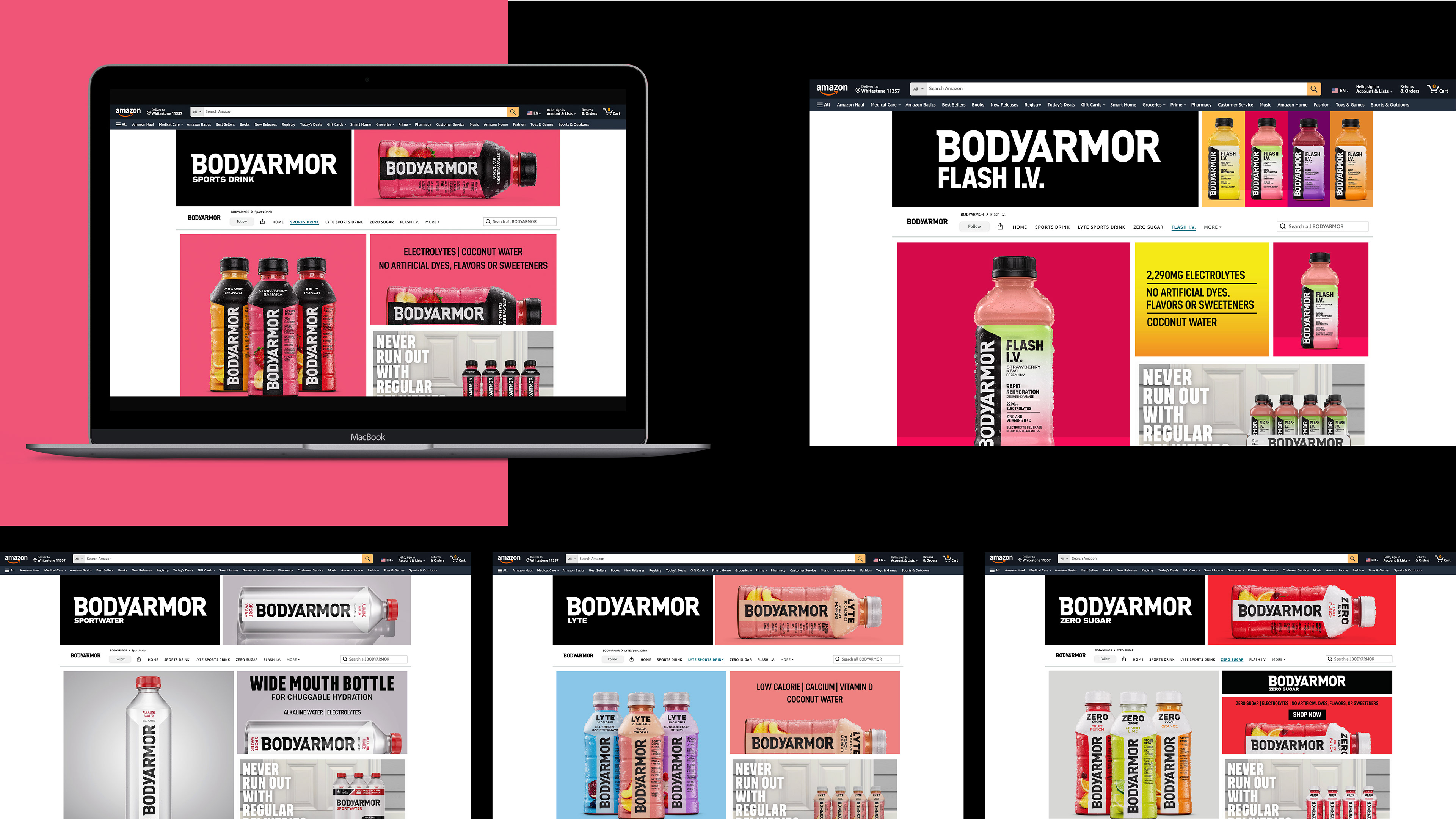 A total overhaul redefining how BODYARMOR shows up digital on Amazon and other retailer platforms through a unified, modernized visual system. I developed a universal ecommerce system that has become the creative framework now serving as a standardized design system for all online partners.