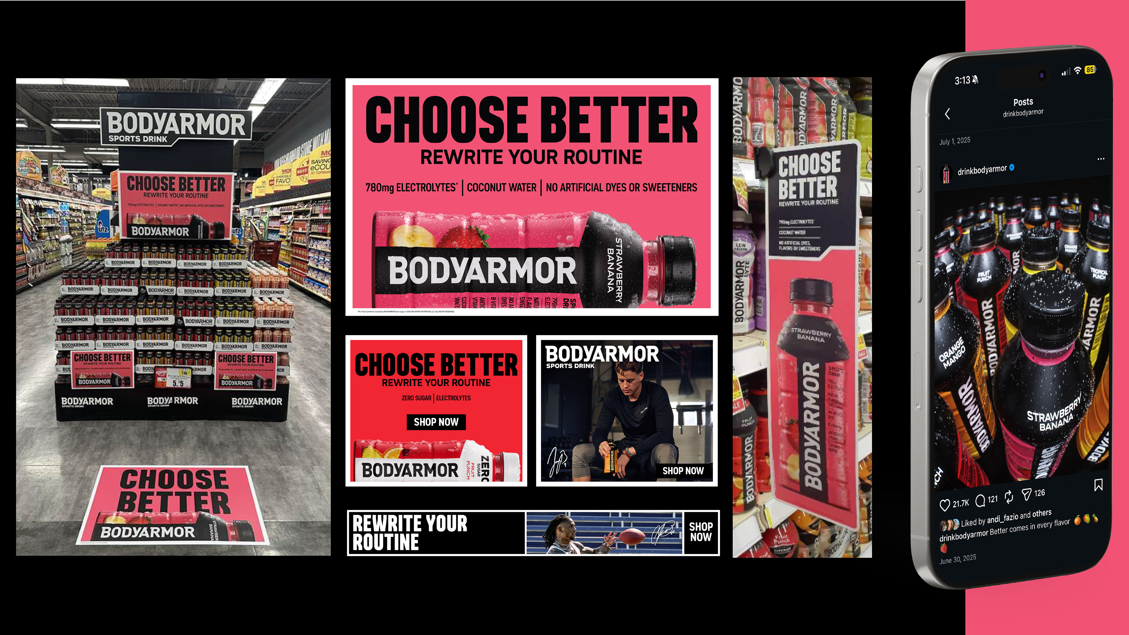 "Rewrite Your Routine," BODYARMOR's 2025 brand slogan and marketing campaign encouraging consumers to break from monotonous habits and "Choose Better" by fueling their active lives with BODYARMOR drinks made from real ingredients for superior hydration, improved workouts, and faster recovery. The campaign promotes a more intentional, healthier lifestyle that goes beyond sports.