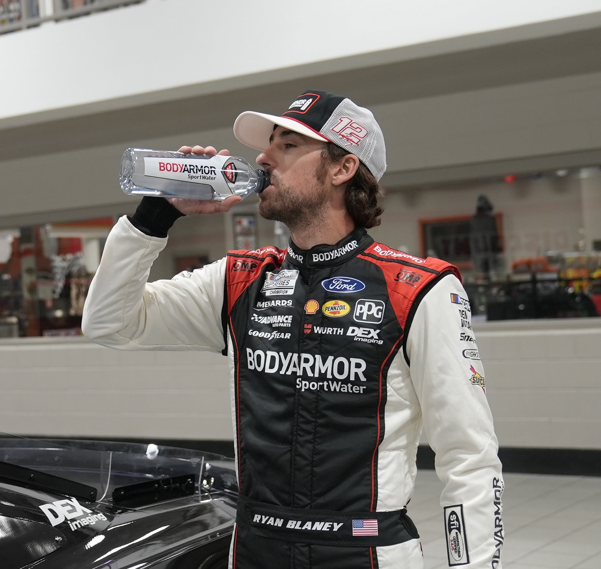 A custom Team Penske paint scheme created for Ryan Blaney to spotlight BODYARMOR SportWater. The car wrap, complemented by coordinated fire suit, helmet, and crew shirt designs—made its debut at NASCAR’s Cook Out 400 in Richmond, Virginia, where Blaney secured an 11th-place finish.