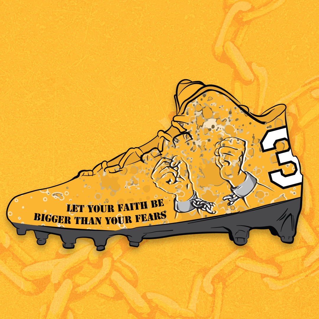 The cleats I designed are representative of Minkah’s faith based non-profit organization, Unshackled. Unshackled is focused around the mantra “let your faith be bigger than your fears.” The organization’s mission is to provide resources and raise awareness for children and families in need.